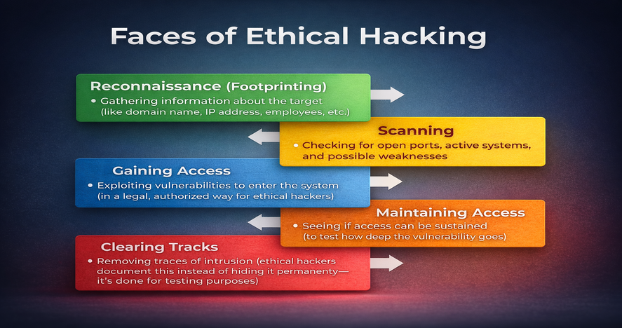 Ethical hacking is often misunderstood as random experimentation with tools and techniques. In reality, it follows a well-structured and professional methodology. Ethical hackers don’t “try things and see what happens.” They follow a planned process designed to identify weaknesses safely, legally, and responsibly. This structured approach ensures that testing strengthens security rather than disrupts operations.Each phase builds on the previous one, creating a complete picture of how secure or vulnerable a system truly is. Let’s break it down in a way that feels practical and real.