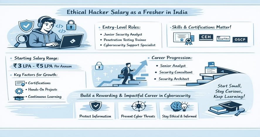 For beginners entering the cybersecurity field in India, salary expectations can vary depending on skills, certifications, company size, and location. Ethical hacking is considered a specialized IT skill, and with the rapid increase in cyber threats, companies across industries are investing heavily in digital security. This growing demand has created strong career opportunities for freshers who are willing to build the right skill set.On average, a fresher in ethical hacking can expect a starting salary between ₹3 LPA and ₹6 LPA in small to mid-sized companies. In larger IT firms, multinational corporations, or product-based companies, the starting package can range from ₹6 LPA to ₹10 LPA, especially if the candidate has strong practical knowledge and relevant certifications. Metropolitan cities like Bangalore, Hyderabad, Pune, Chennai, and Mumbai often offer slightly higher salaries due to higher demand and cost of living.Freshers typically begin their careers in roles such as junior security analyst, penetration testing trainee, or SOC (Security Operations Center) analyst. These positions focus on monitoring security systems, identifying vulnerabilities, supporting senior security professionals, and gaining hands-on exposure to real-world cybersecurity challenges. The initial years are crucial for building technical depth and understanding how organizations defend against cyber attacks.Several factors influence a fresher’s salary in ethical hacking. Practical skills in networking, operating systems, and basic scripting are highly valued. Hands-on experience through labs, internships, or participation in bug bounty programs can significantly improve employability. Certifications from recognized organizations like EC-Council and CompTIA also strengthen a candidate’s profile, although skills and practical exposure remain more important than certificates alone.Continuous learning plays a major role in salary growth. Cybersecurity is a rapidly evolving field, and professionals who stay updated with new tools, threats, and defensive strategies tend to progress faster. With two to three years of experience, salaries often increase substantially, andprofessionals may move into higher-paying roles such as penetration tester, security consultant, or senior analyst. Over time, experienced ethical hackers can advance to leadership or specialized technical positions with significantly higher compensation.Overall, ethical hacking offers promising long-term growth in India. While starting salaries may vary, the field rewards dedication, consistent skill development, and adaptability. For freshers who are passionate about cybersecurity and committed to learning, career progression and earning potential can be highly rewarding.